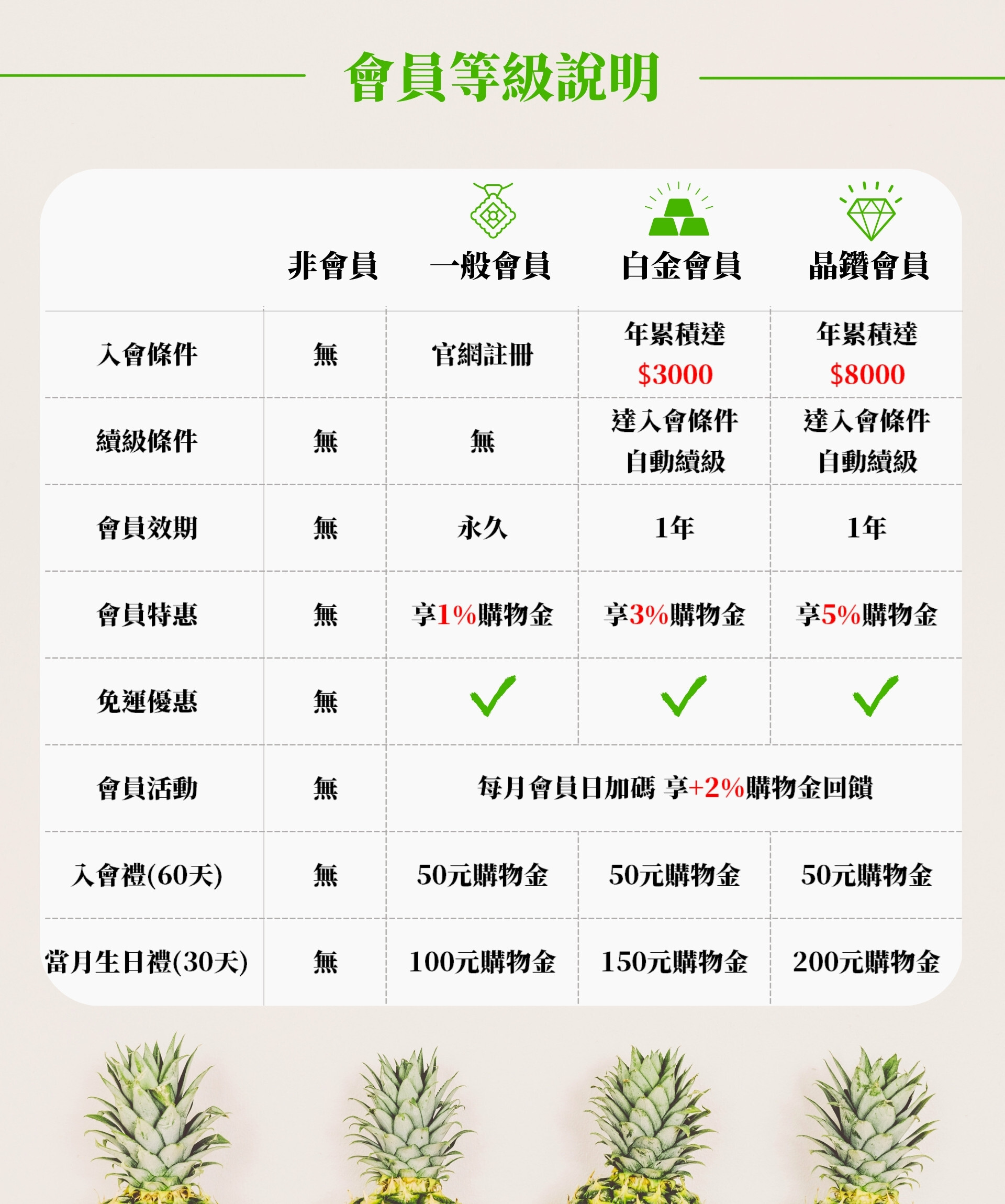 白金會員:每年官網消費累積達3000元即可晉級為白金會員,官網購物每筆訂單可得 3% 購物金回饋。