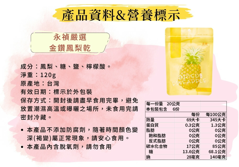 | 品名 | 永禎嚴選金鑽鳳梨乾 |