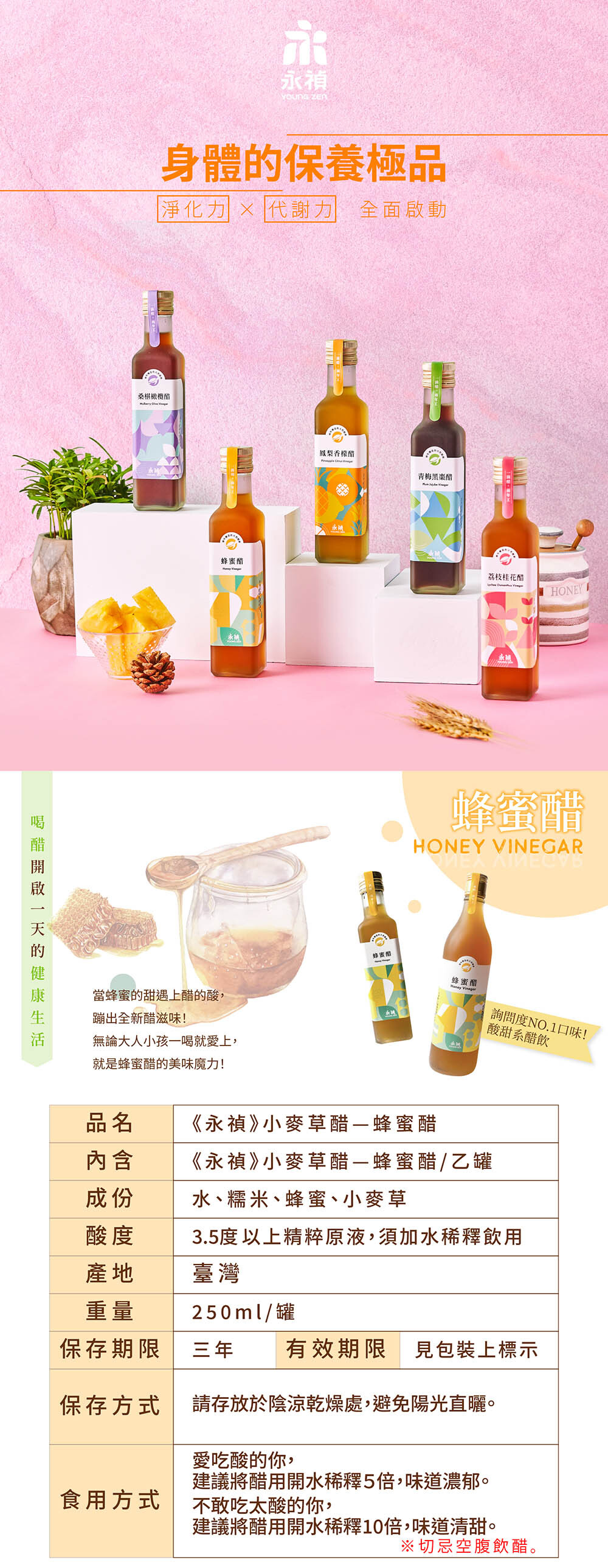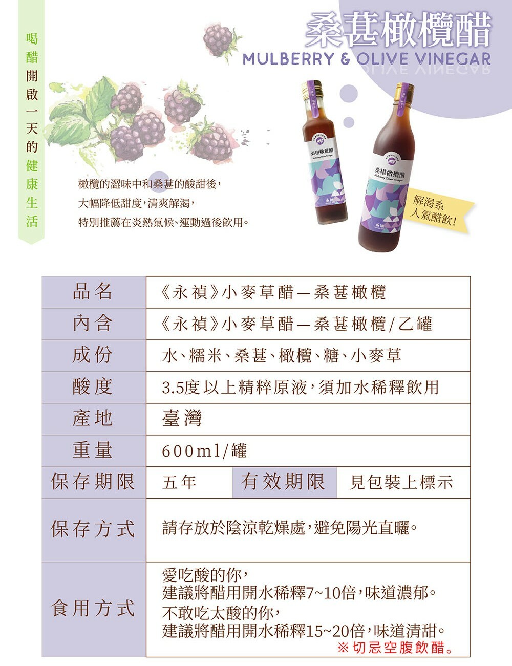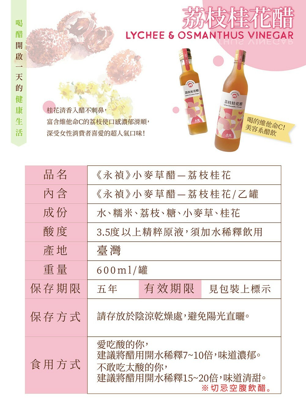 | 食用方式 | ◎ 愛吃酸的你,建議將醋用開水稀釋5-10倍,味道濃郁。 ◎ 不敢吃太酸的你,建議將醋用開水稀釋15-20倍,味道清甜。 ◎ 冰鎮過更好喝喔~ 飲用永禎產品經驗豐富的您,可以依據個人喜好靈活搭配各種喝法。 |
