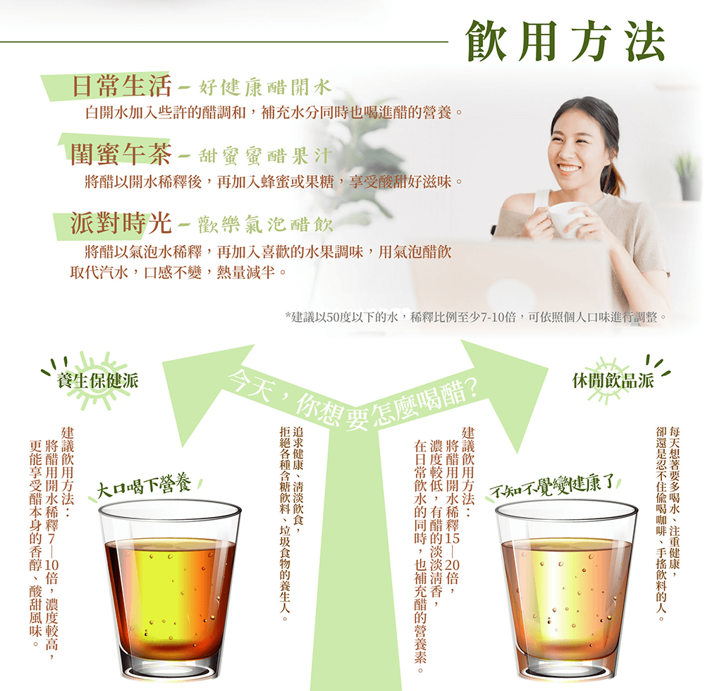 | 注意事項 | ※醋飲為保養用,不具立即療效。 ※效腸胃敏感者,避免空腹飲醋,建議飯後飲用為佳。 |