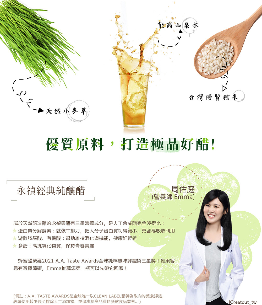 屬於天然釀造醋的永禎果醋有三重營養成分,是人工合成醋完全沒得比: