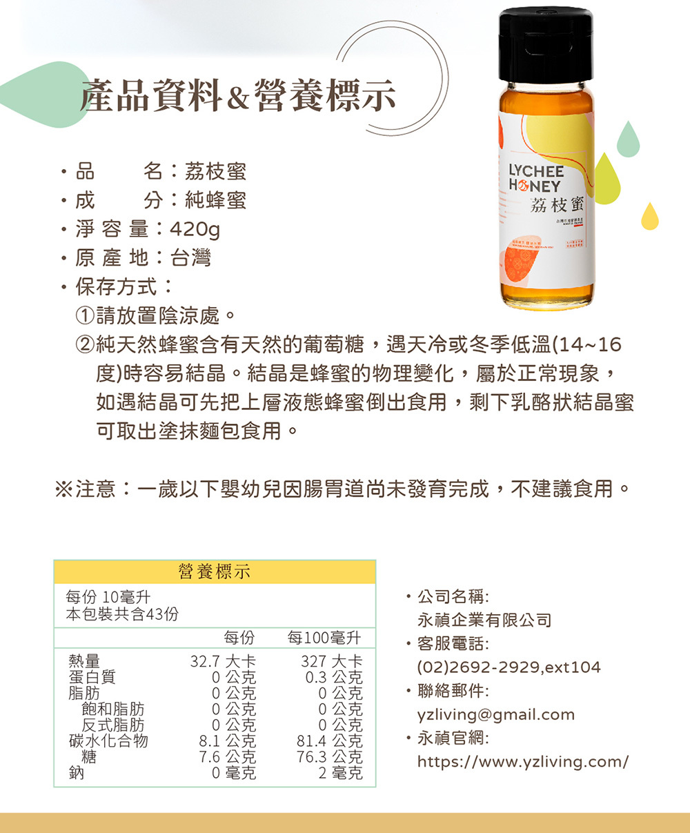 | 注意事項 | 一歲以下嬰幼兒因腸胃道尚未發育完成,不建議食用。 |