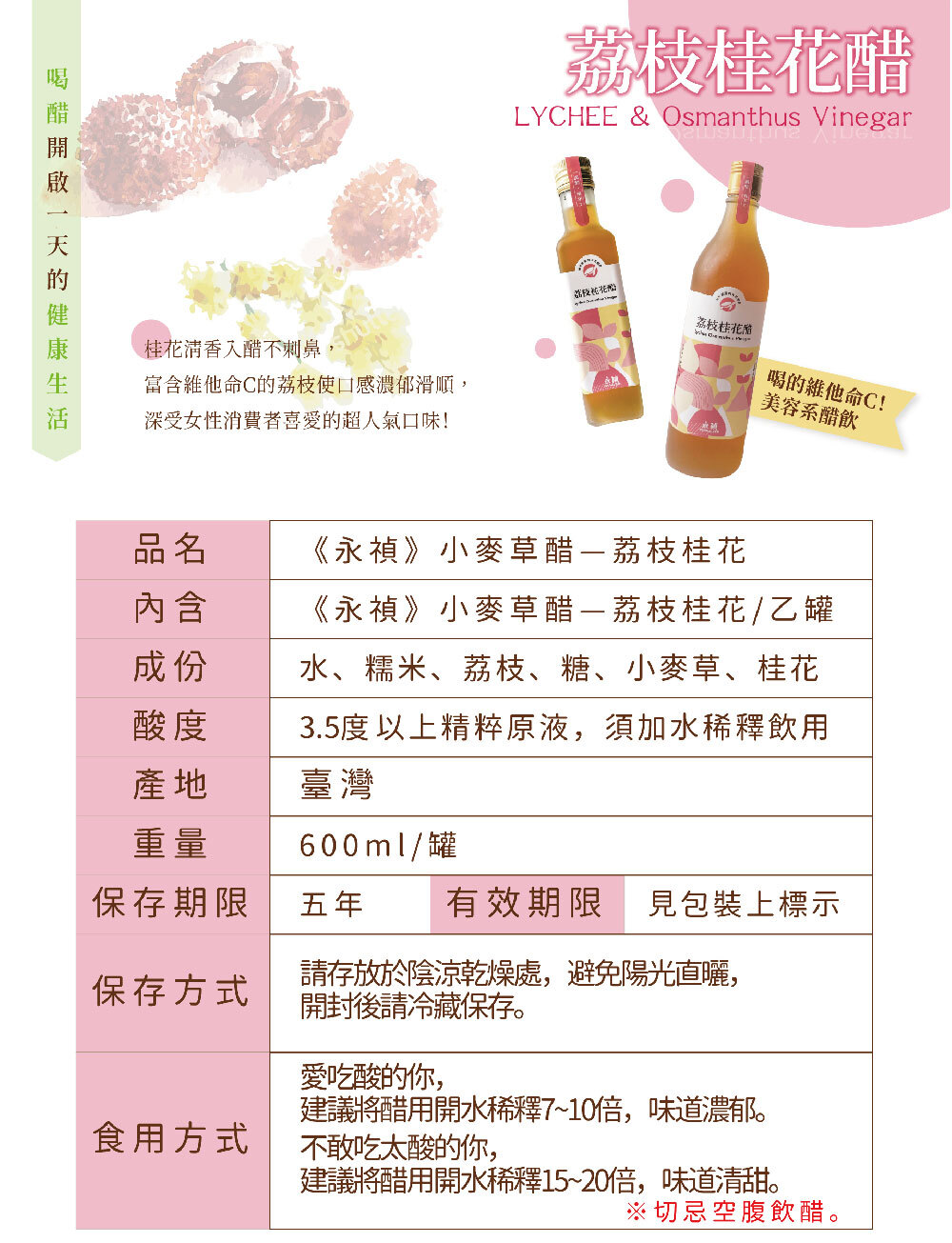 ◆ 濃醇果醋:精選濃醇醋,五種口味可以選: 蜂蜜、荔枝桂花、青梅黑棗、桑椹橄欖、鳳梨香檬