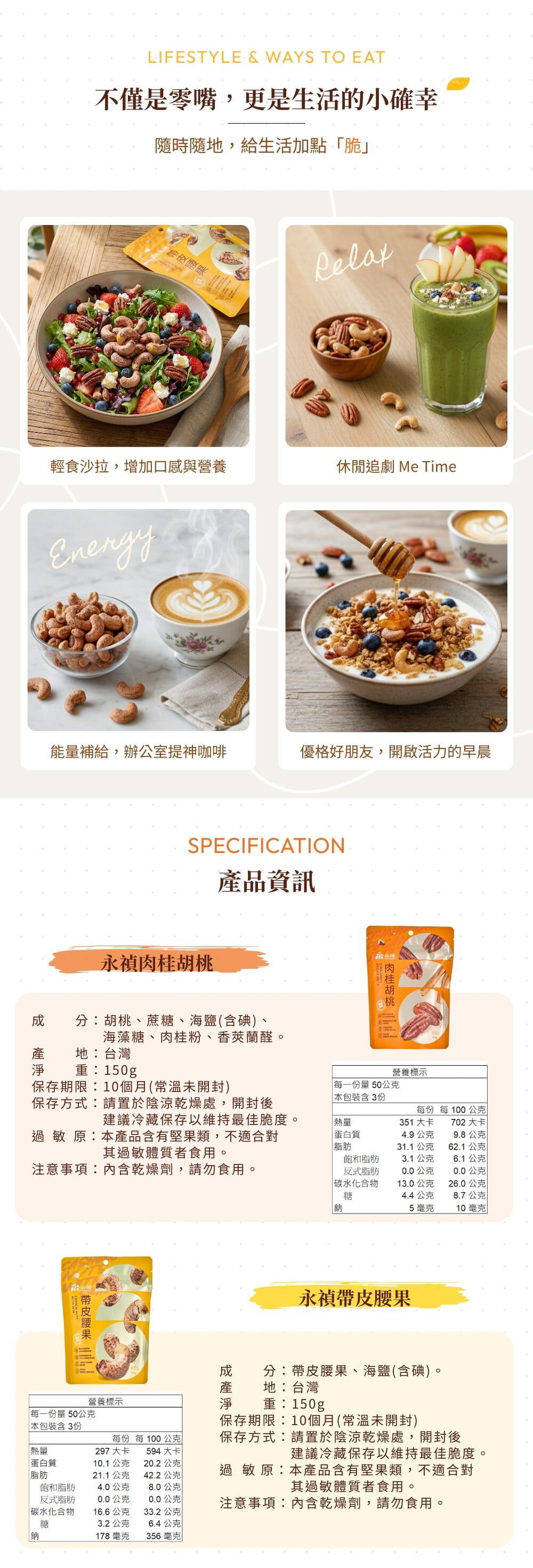 | 內含 | 永禎肉桂胡桃150g x 1包 永禎帶皮腰果150g x 1包 |