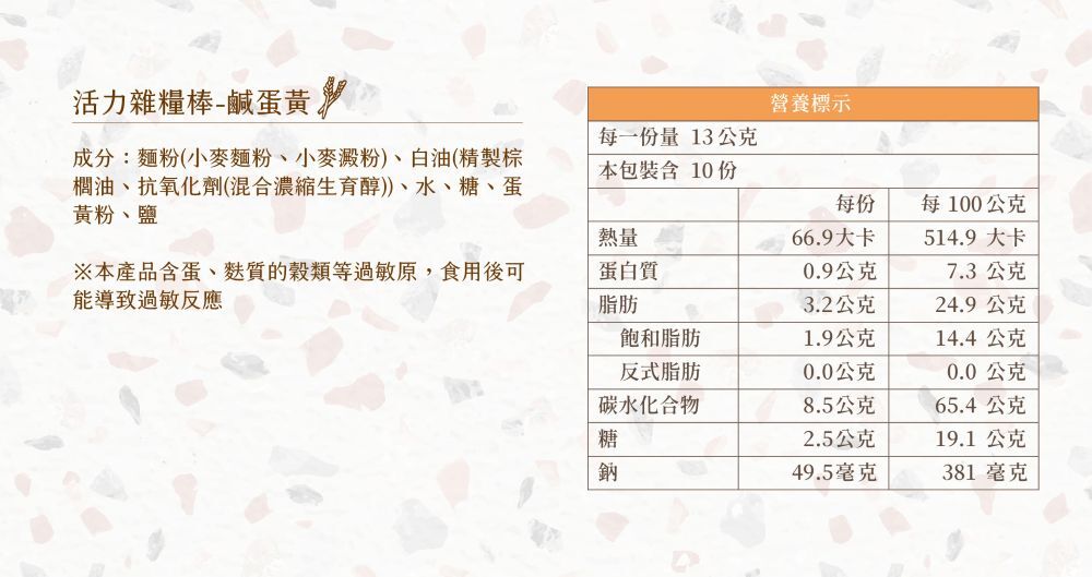 | 內含 | 活力雜糧棒 - 鹹蛋黃130g x 1包 (一包內含10根) |