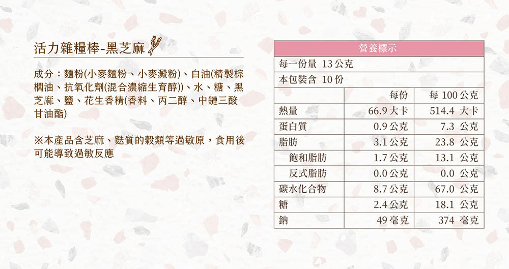 | 內含 | 活力雜糧棒 - 黑芝麻130g x 1包 (一包內含10根) |