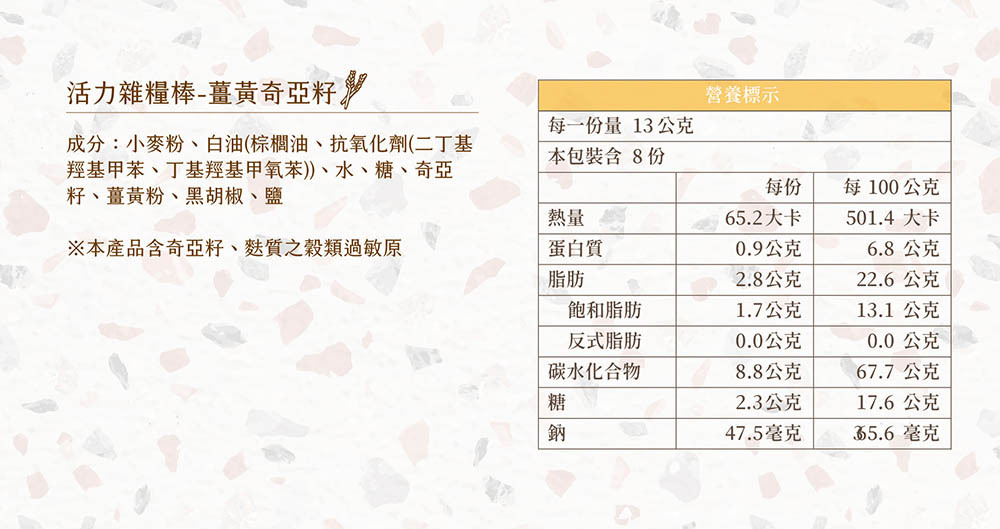 | 內含 | 活力雜糧棒 - 薑黃奇亞籽104g x 1盒 (一包內含8根) |
