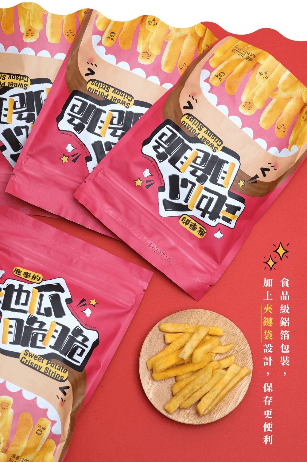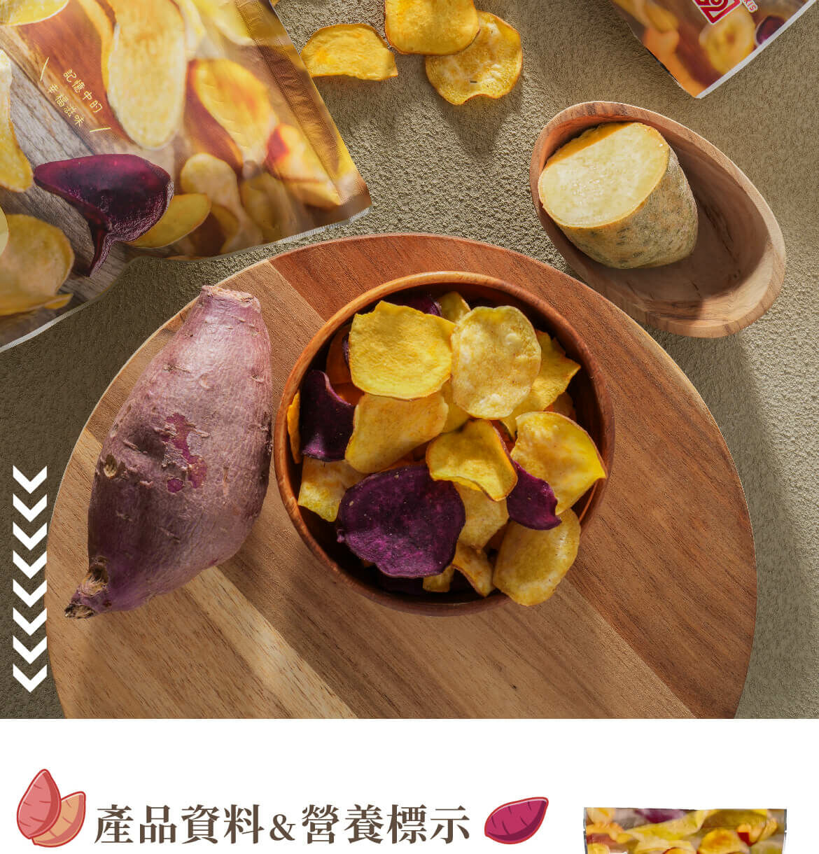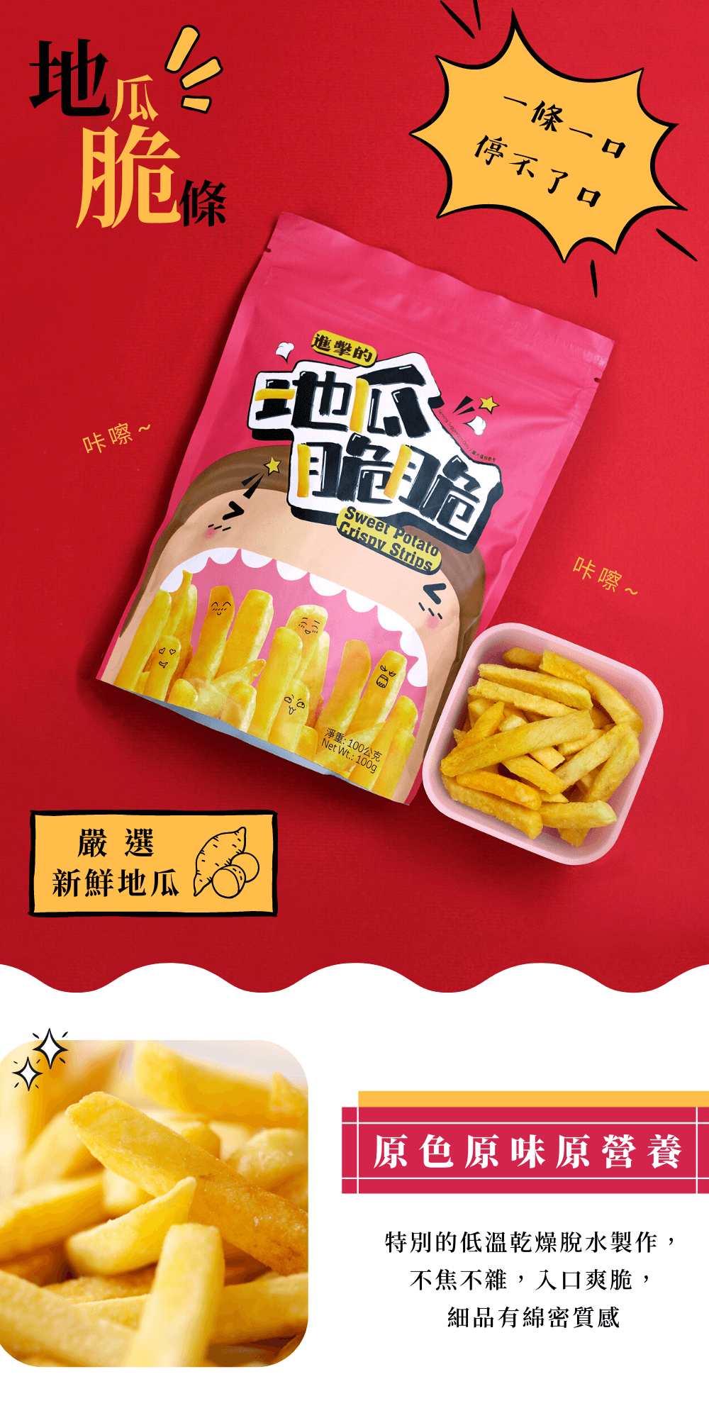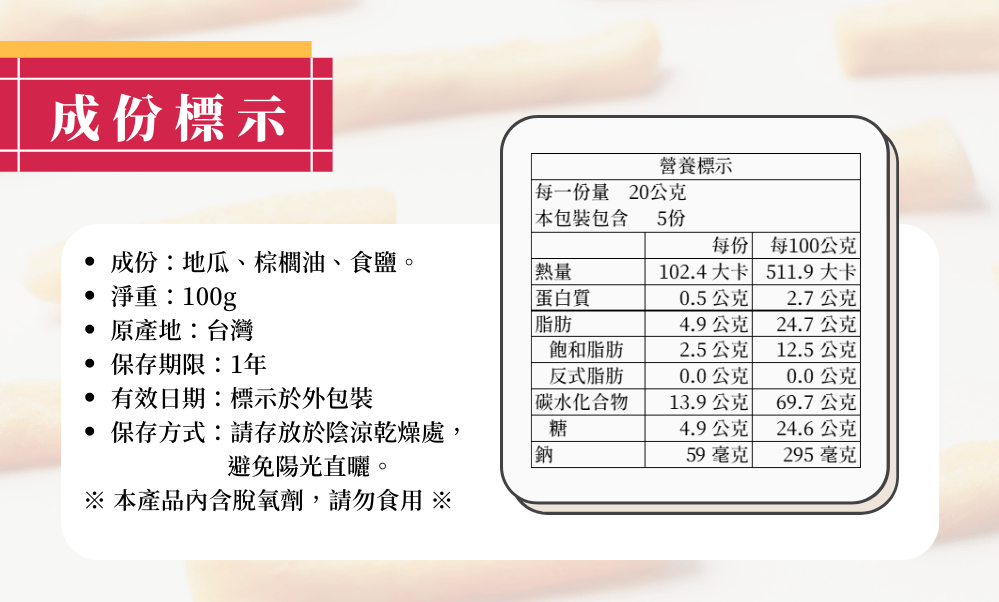 | 成分 | 纖脆薯:地瓜(黃地瓜、紫地瓜)、非基改精製芥花油、麥芽糖、食鹽。 地瓜脆條:地瓜、棕櫚油、食鹽。 |
