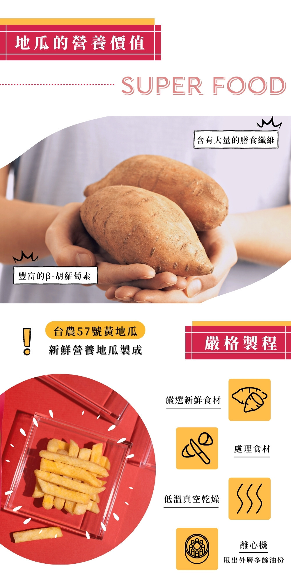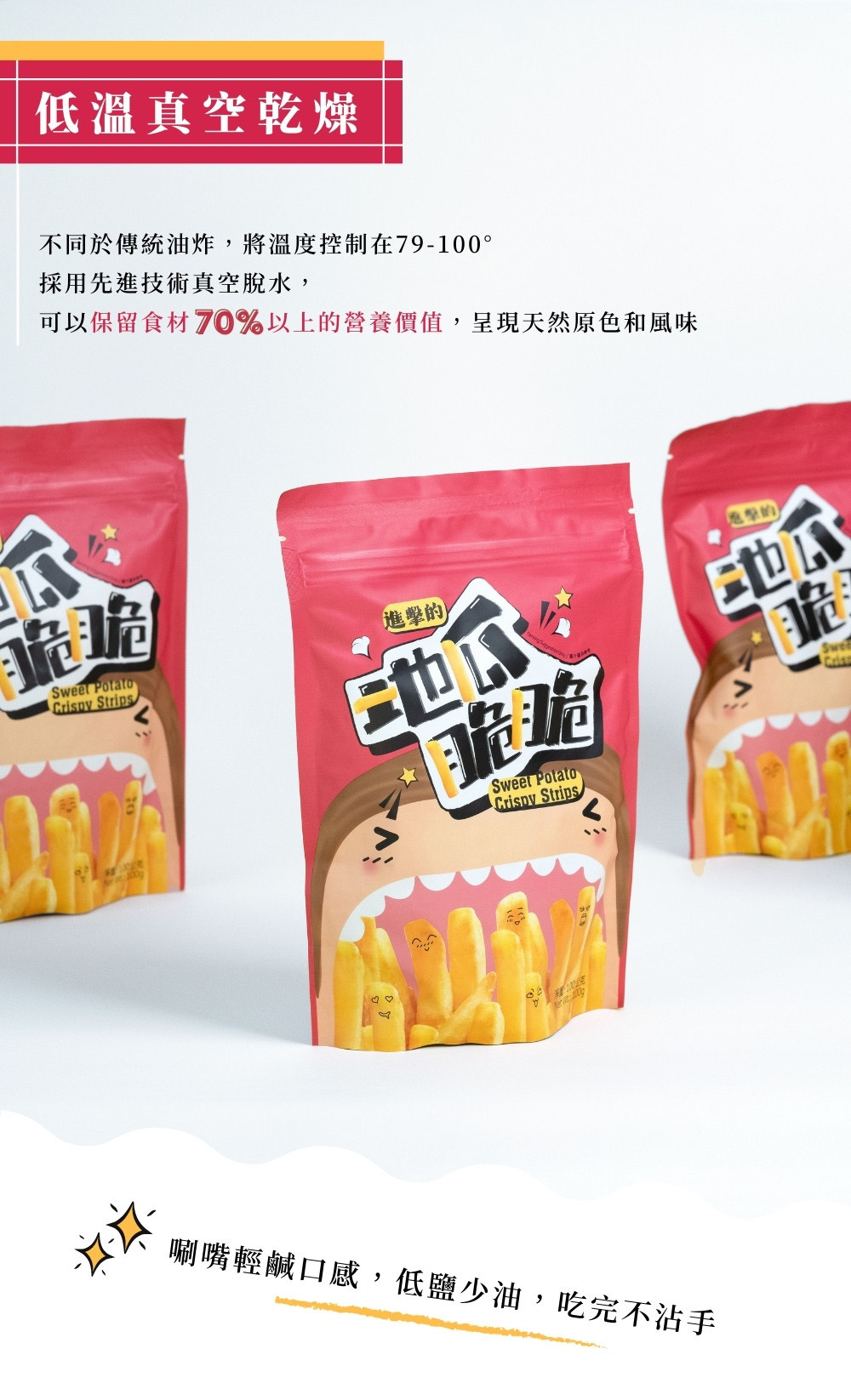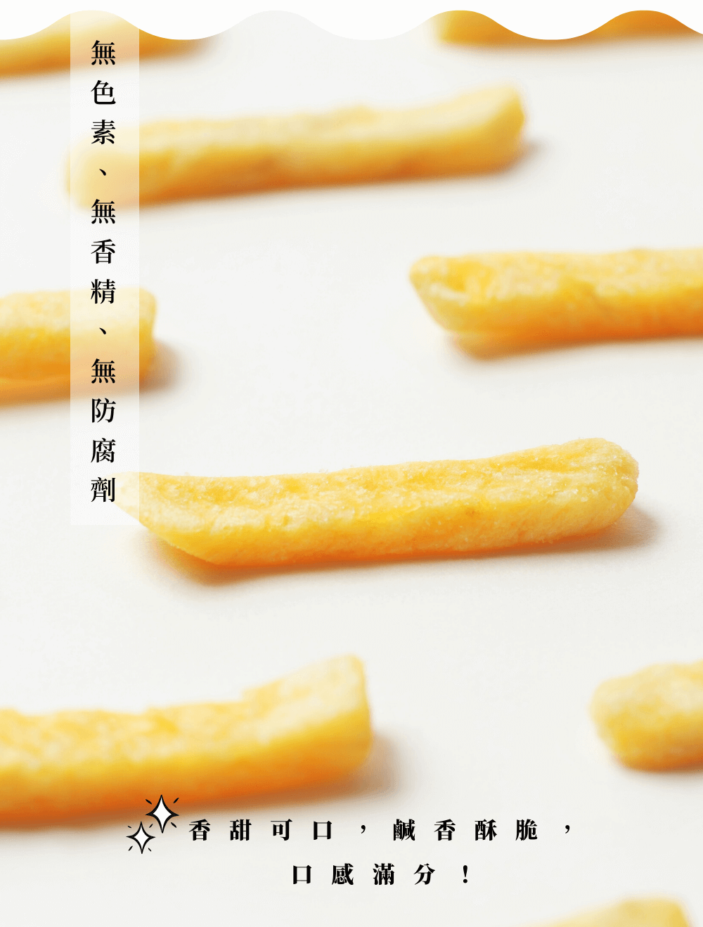 | 成分 | 纖脆薯:地瓜(黃地瓜、紫地瓜)、非基改精製芥花油、麥芽糖、食鹽。 地瓜脆條:地瓜、棕櫚油、食鹽。 |